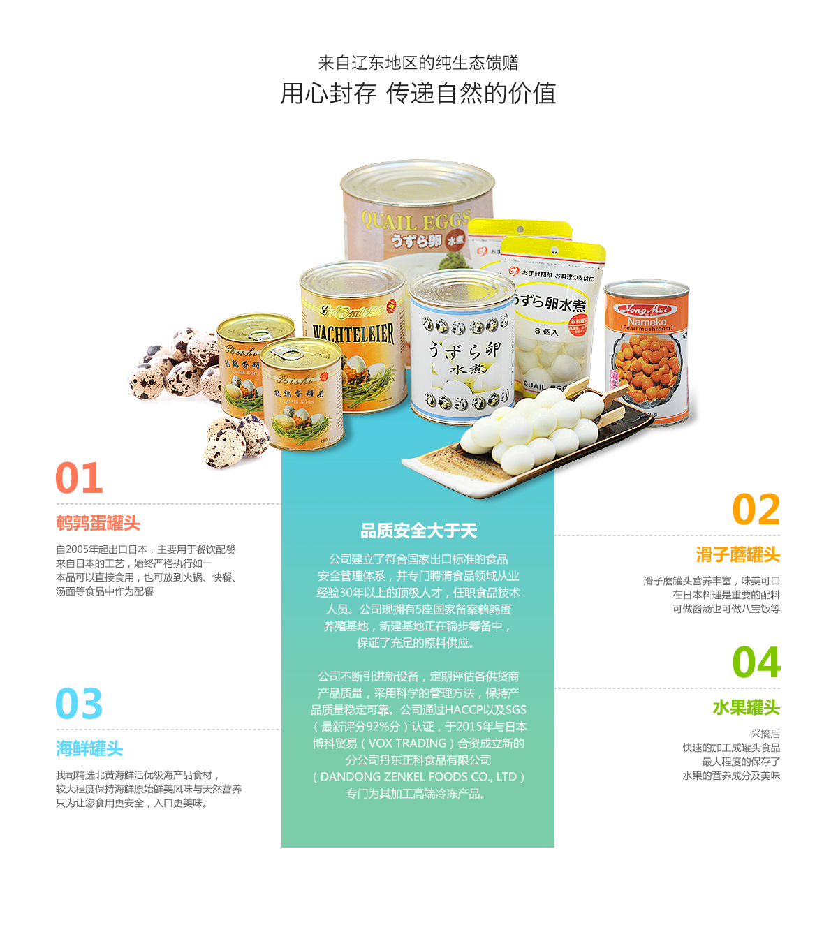 丹東日食食品有限公司是一家專注罐頭及速凍生產的食品加工型企業(yè)。公司主要產品為鵪鶉蛋罐頭、滑子蘑罐頭、冷凍產品等,年產量約5000噸。其中,鵪鶉蛋罐頭出口量位居近年國內頭部;滑子蘑罐頭出口量也列國內前位。各種產品主要出口日本,并遠銷德國、澳大利亞、新加坡等國家和地區(qū)。